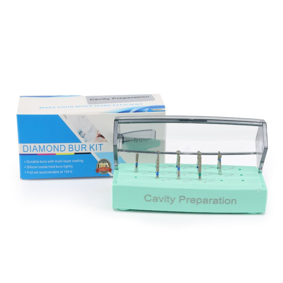 The set includes complete range of diamond burs of different shapes suited for cavity preparation to receive restorative material.